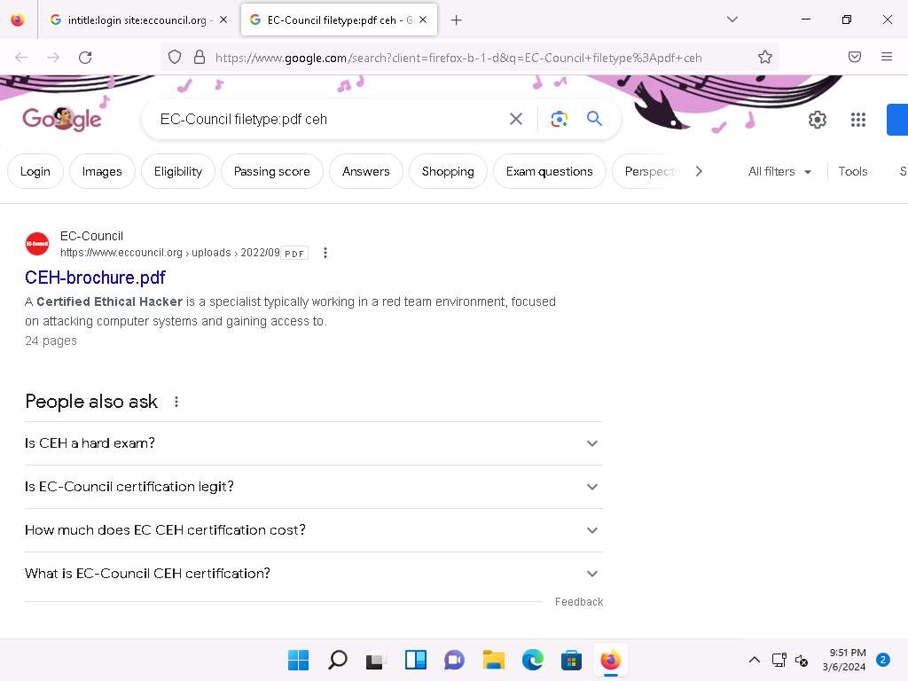 Similarly, type the command EC-Council filetype:pdf ceh in the search bar to search your results based on the file extension and the keyword (here, ceh). Click on any link from the results (here, CEH-brochure.pdf) to view the pdf file.